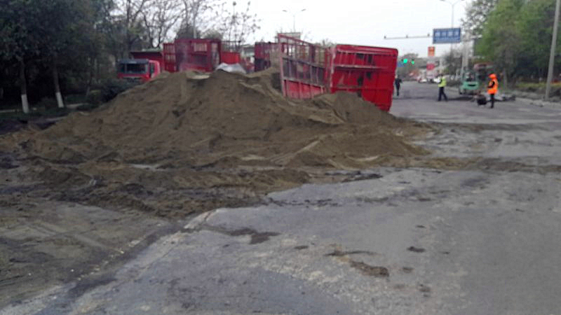 4月12日早上7:20,綿江路K282+100西科大門口,兩輛滿載砂石的運(yùn)輸貨車,在江油至綿陽方向行駛的過程中,因變道發(fā)生撞車事故。事故現(xiàn)場砂石嚴(yán)重傾覆路面,其中一輛運(yùn)輸貨車冒起白煙,情況十分嚴(yán)峻。