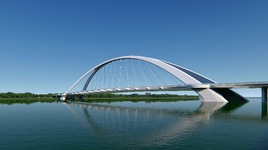 “撫音悅迎八方客,砥礪奮進(jìn)謀新篇”,寓意綿陽科技城在現(xiàn)代化建設(shè)歷程中,以開放、包容的姿態(tài)不斷迎接著新事物,開拓創(chuàng)新,與時代接軌互聯(lián)?!皳崆僮V韻”為主跨243m提籃拱,主拱猶如張開的風(fēng)琴般奏出美妙的音樂,簡約唯美。兩翼出挑的人行道猶如張開的雙臂,豐富行人感官體驗,與主拱共同譜寫出一曲浪漫的現(xiàn)代樂章,全橋視覺通透性好,有著強烈的韻律感。