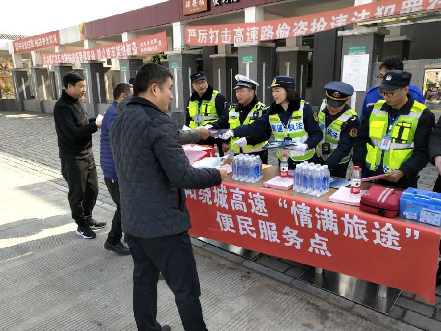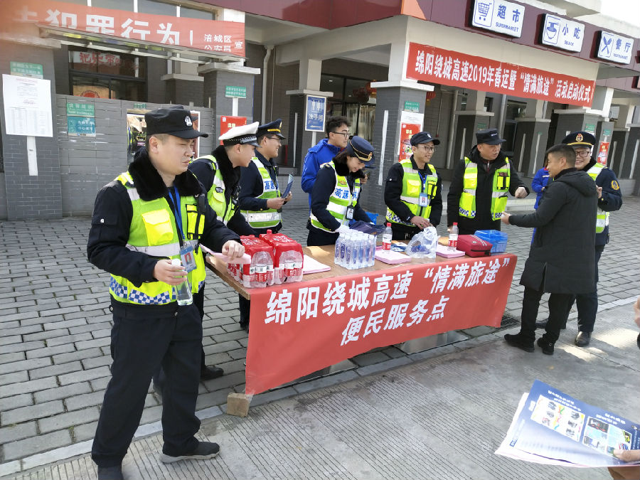 1 月 21 日,綿陽繞城高速管理所聯(lián)合高速交通執(zhí)法、高速交警 在綿陽南服務(wù)區(qū)舉行了綿陽繞城高速 2019 年春運(yùn)暨“情滿旅途” 活動(dòng)啟動(dòng)儀式。儀式現(xiàn)場(chǎng)設(shè)立了“春運(yùn)安全 情滿旅途”宣傳點(diǎn) 和便民服務(wù)點(diǎn),積極開展了咨詢引導(dǎo)、秩序維護(hù)、便民利民、應(yīng) 急救護(hù)等便民服務(wù)工作,主動(dòng)為過往司乘人員特別是農(nóng)民工提供 開水藥品、交通咨詢、車輛維修、應(yīng)急救援等暖心服務(wù),充分讓農(nóng)民工兄弟感受到回鄉(xiāng)返崗旅途的溫暖,增進(jìn)了人民群眾對(duì)綿陽 繞城高速春運(yùn)服務(wù)的獲得感和認(rèn)同感。為確保綿陽繞城高速春運(yùn) 期間安全營運(yùn)奠定了堅(jiān)實(shí)的基礎(chǔ)。