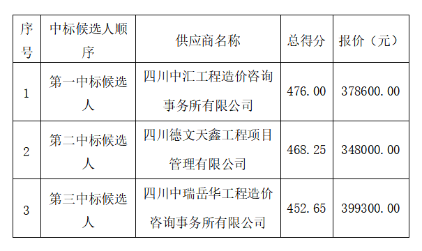 我公司委托四川久安工程管理有限公司代理招標的“省道205線綿陽繞城段改線建設工程(游仙區(qū)段)項目結算復核審計服務”項目(項目編號:四川久安招[2021]7號)于2021年08月19日13時30分(北京時間)進行公開招標,現(xiàn)對評審結果公示如下: ?