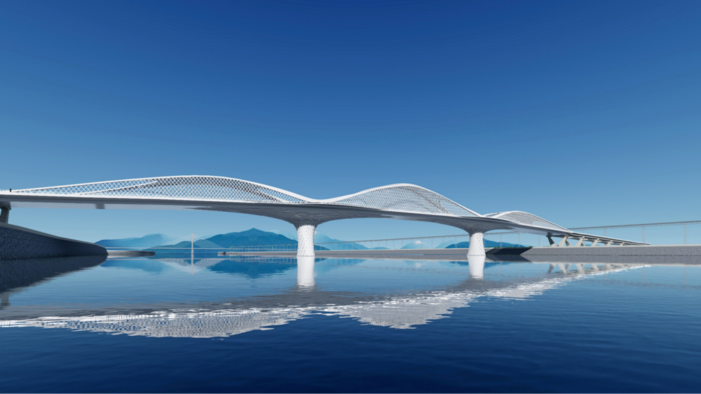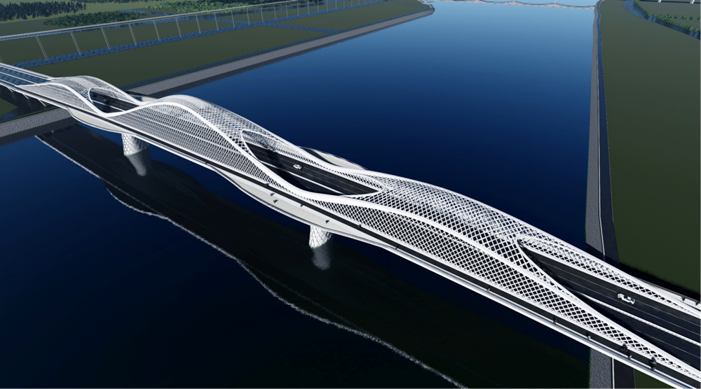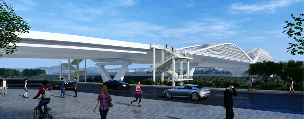 橋梁為主跨180m 連續(xù)梁橋,橋面設(shè)置層次豐富的空間網(wǎng)狀構(gòu)架,造型設(shè)計新穎,猶如在時空之隧中穿梭,體現(xiàn)綿陽科技之城不斷探求未知世界、永攀科技高峰精神?! ?/p>