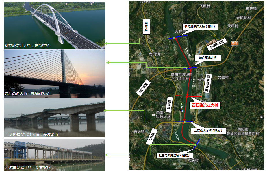 ? ? ? ?青石路涪江大橋是科技城新區(qū)北翼橫跨涪江,聯(lián)系涪城青義片區(qū)、游仙石馬片區(qū)的重要橋梁。項目起于青義鎮(zhèn)綿江路與青石路交叉口,止于石馬鎮(zhèn)科學(xué)城大道與青石路交叉口,全長約1.3km,含橋梁及道路兩側(cè)綠化景觀工程。