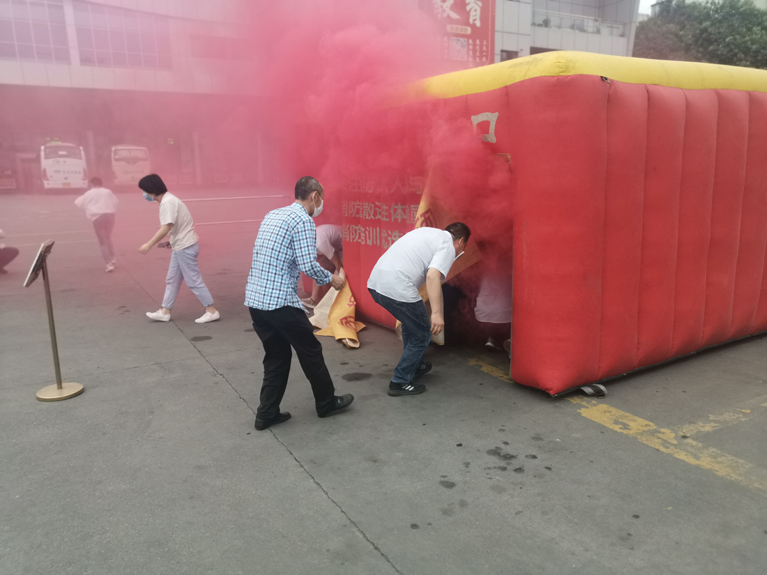 ? ? ? ?15時(shí)30分,演練正式開(kāi)始。在李松的現(xiàn)場(chǎng)指導(dǎo)下,參訓(xùn)職工聽(tīng)到警報(bào)后按照預(yù)案和分工,迅速疏散人員,用濕毛巾捂住口鼻,彎腰穿越模擬濃煙霧區(qū),從樓層兩側(cè)安全出口迅速有序撤離至安全區(qū)。
