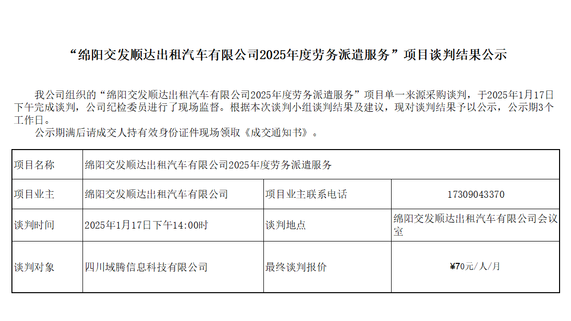 “綿陽交發(fā)順達(dá)出租汽車有限公司2025年度勞務(wù)派遣服務(wù)”項目談判結(jié)果公示