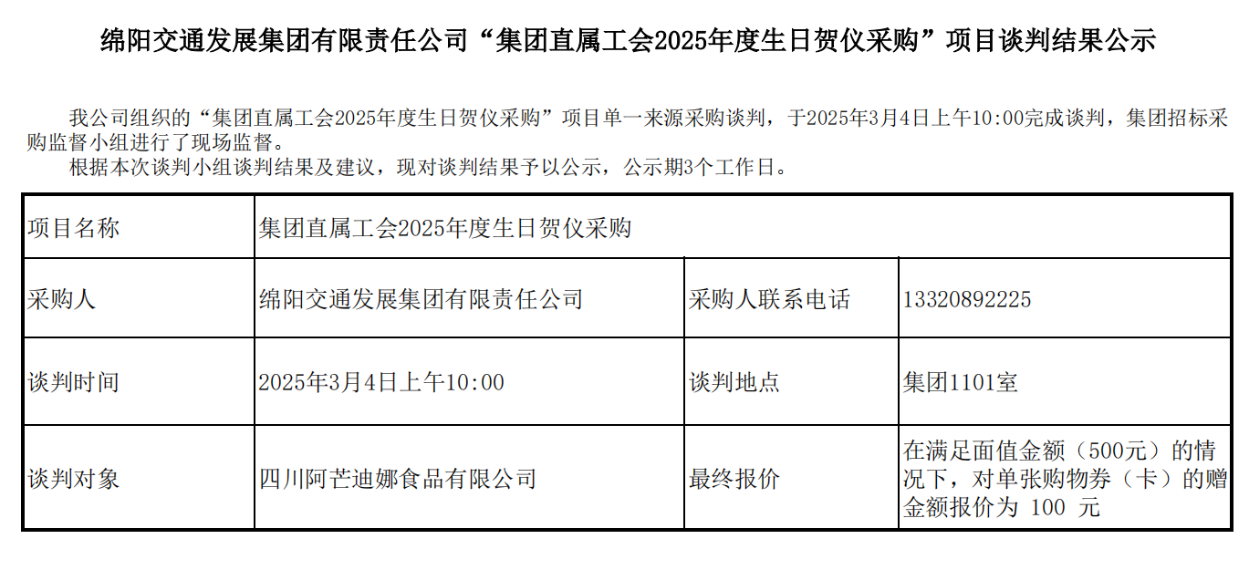 綿陽交通發(fā)展集團(tuán)有限責(zé)任公司“集團(tuán)直屬工會(huì)2025年度生日賀儀采購”項(xiàng)目談判結(jié)果公示