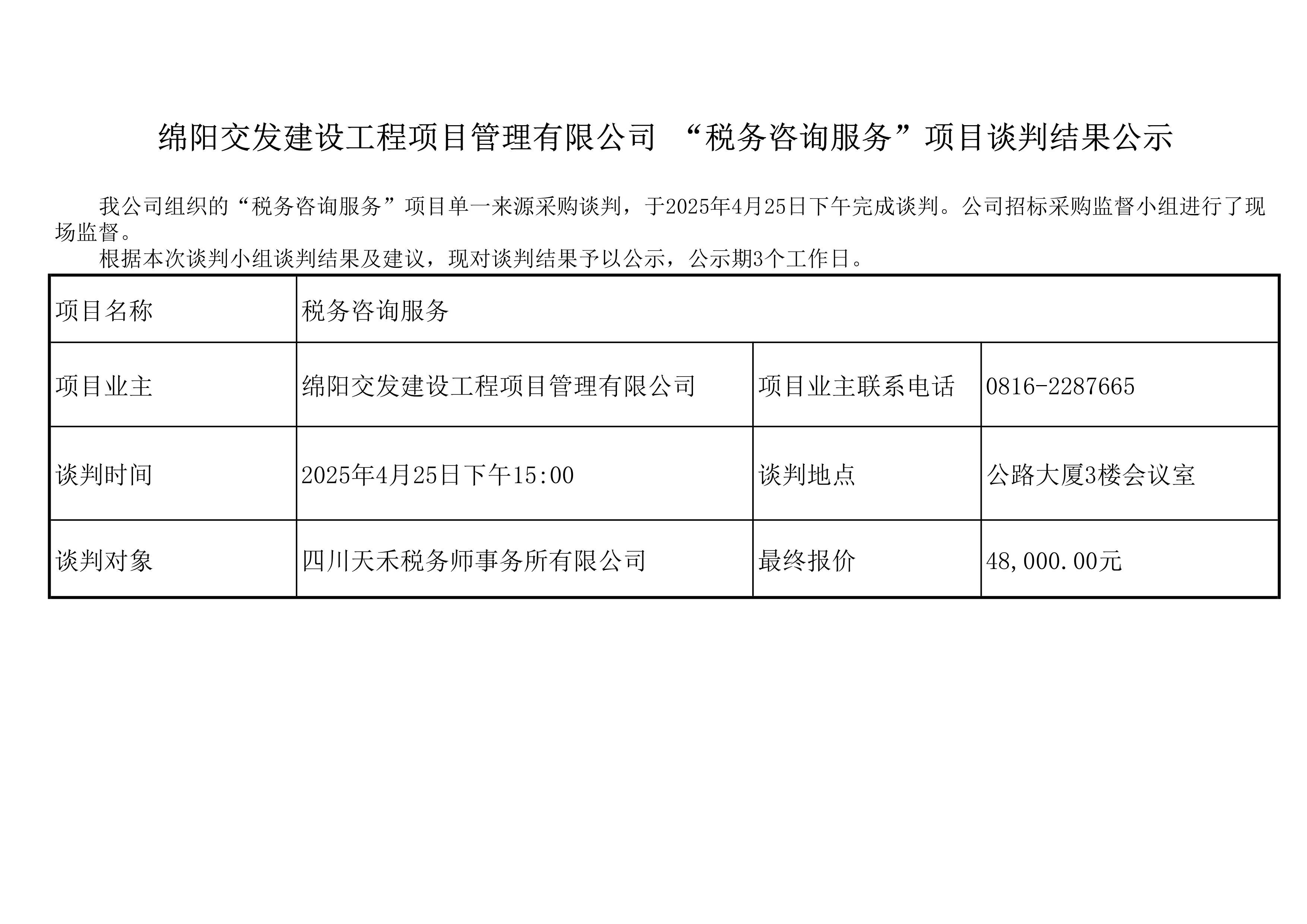 綿陽交發(fā)建設(shè)工程項(xiàng)目管理有限公司 “稅務(wù)咨詢服務(wù)”項(xiàng)目談判結(jié)果公示