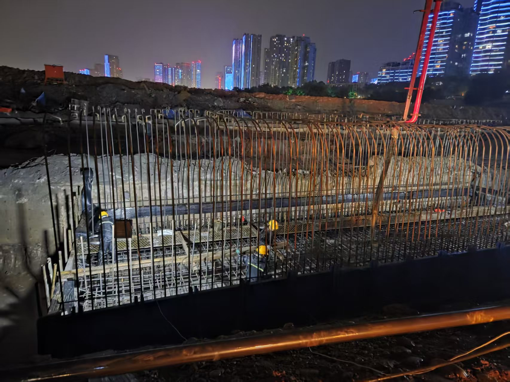 為確保本次混凝土澆筑成功,各參建方多措并舉,施工團隊提前精心籌備,從混凝土配合比優(yōu)化、澆筑方案制定,到人員設備調(diào)配、應急預案完善,均進行了細致部署,嚴格把控原材料質(zhì)量,對模板支撐、鋼筋綁扎等關(guān)鍵工序開展多輪檢查驗收,以“零誤差、零缺陷”的標準保障施工質(zhì)量。此次澆筑既檢驗了施工組織能力,更積累了復雜環(huán)境下的施工經(jīng)驗,全體施工人員堅守崗位、密切配合,實時監(jiān)測混凝土坍落度、澆筑速度等指標,確保每一方混凝土都精準澆筑到位?,F(xiàn)場技術(shù)人員全程跟蹤指導,及時解決突發(fā)問題,保障施工安全有序推進。