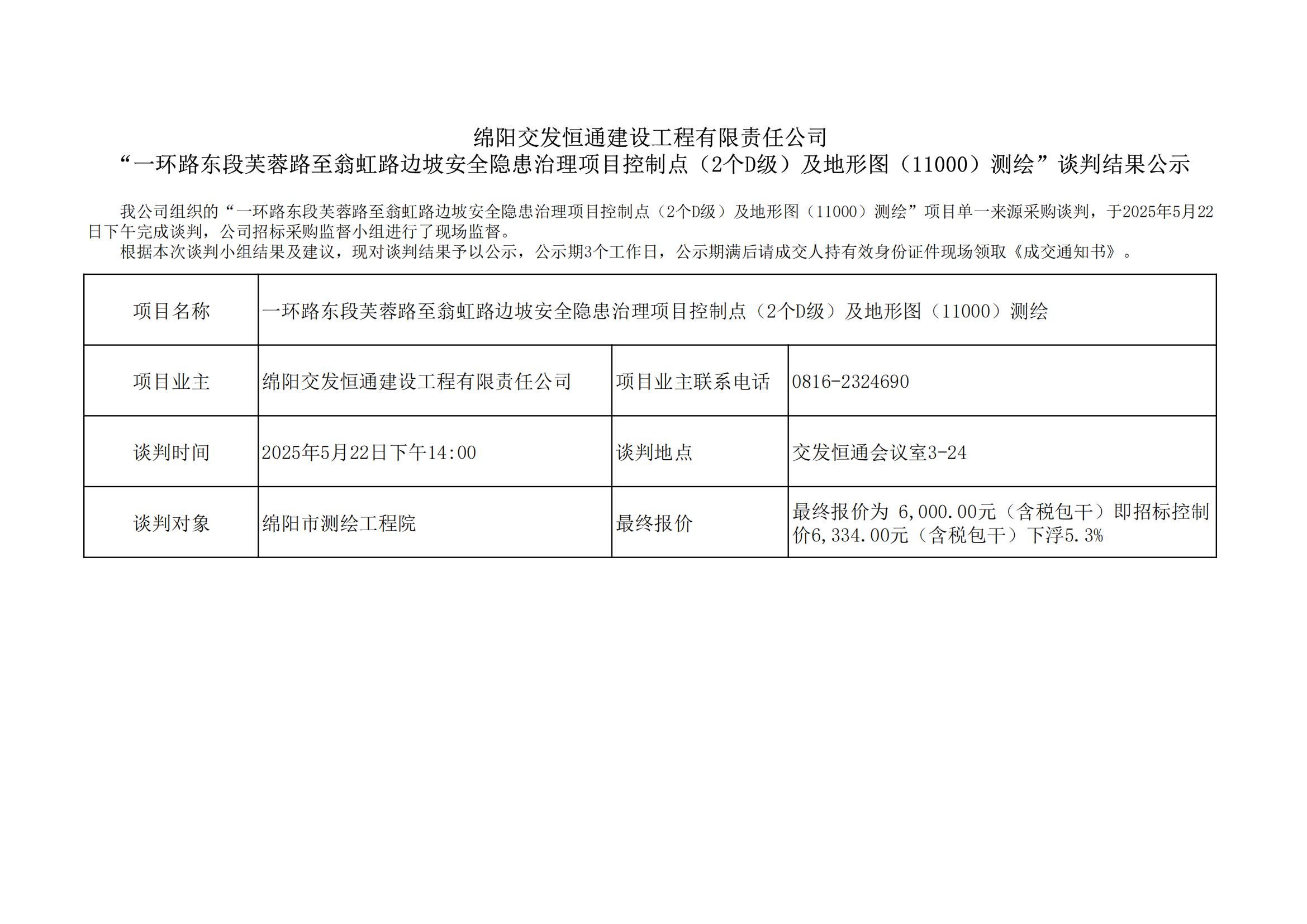 綿陽(yáng)交發(fā)恒通建設(shè)工程有限責(zé)任公司一環(huán)路東段芙蓉路至翁虹路邊坡安全隱患治理項(xiàng)目控制點(diǎn)(2個(gè)D級(jí))及地形圖(11000)測(cè)繪談判結(jié)果公示