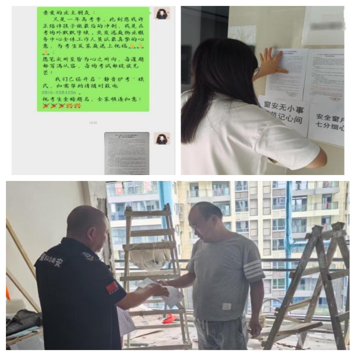溫情服務(wù),撐起安心傘。交發(fā)實業(yè)多措并舉開展“溫情護(hù)考”物業(yè)行動,安排專人24小時值守監(jiān)控室并增加小區(qū)巡邏頻次,重點關(guān)注人員活動、車輛通行等情況,及時發(fā)現(xiàn)可能產(chǎn)生噪音源,做到早發(fā)現(xiàn)、早協(xié)調(diào)、早解決;積極主動與裝修業(yè)主和小區(qū)底商溝通,逐一上門發(fā)放《禁噪告知書》,同時通過業(yè)主微信群、朋友圈、小區(qū)公告欄、電梯轎廂等線上線下渠道發(fā)布《靜音倡議書》,呼吁全體業(yè)主攜手開啟“靜音模式”,為小區(qū)考生打造安靜、和諧、溫馨的備考環(huán)境。