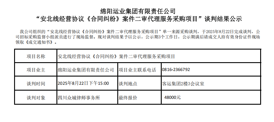 綿陽運業(yè)集團有限責(zé)任公司“安北線經(jīng)營協(xié)議《合同糾紛》案件二審代理服務(wù)采購項目”談判結(jié)果公示