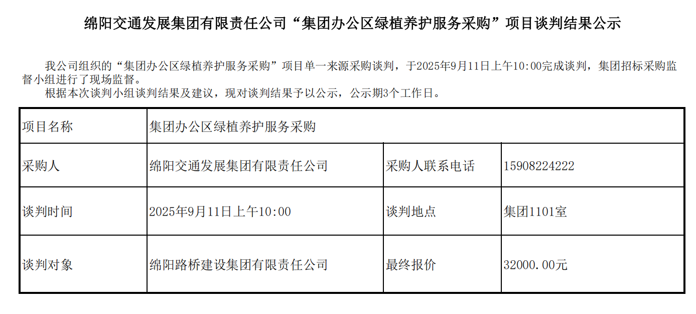 綿陽交通發(fā)展集團(tuán)有限責(zé)任公司“集團(tuán)辦公區(qū)綠植養(yǎng)護(hù)服務(wù)采購”項(xiàng)目談判結(jié)果公示