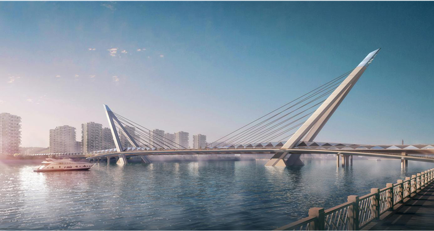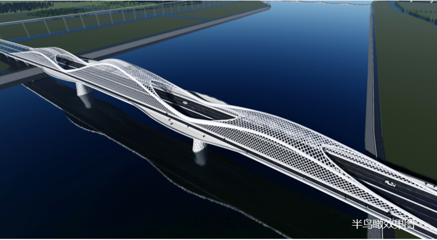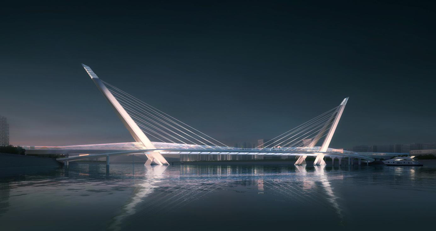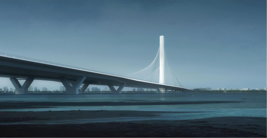 橋型采用主跨2×152m 空間索面斜拉橋。主塔似巨柱擎天,配合如禪意般的索面扭轉(zhuǎn)空間,猶如破水而出、蓄勢待飛的雕塑。