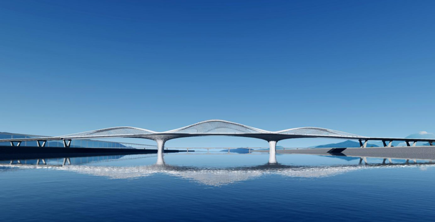 方案采用主跨186m中承式無風(fēng)撐剛箱拱橋,提取高山自然弧線,經(jīng)簡化演變成體量形態(tài)各不相同的雙連拱。線條簡潔,體態(tài)靈動(dòng),高山、河流、生態(tài)綠地巧妙融合,構(gòu)成一幅靜逸的場景。