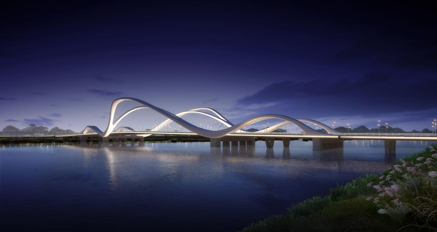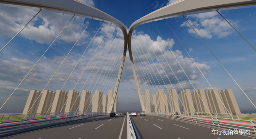 橋梁采用主橋300m下承式系桿拱橋。主拱拱肋具有雕塑感,模仿種子萌芽造型,搭配兩側(cè)小拱,形成眾星捧月之勢,寓意科技創(chuàng)新的萌芽,充分表達(dá)科技城的創(chuàng)新力、生命力。