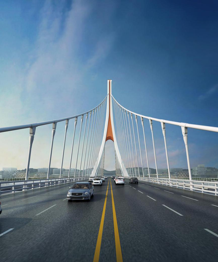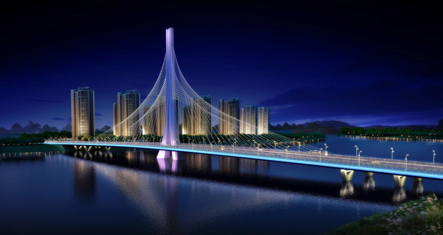 橋梁采用主跨2×156m獨(dú)塔懸索橋。方案以四面匯聚的“人”薈萃為多視角下的“眾”,融洽成“人和”,象征綿陽人杰地靈,吸引四面八方的人才匯聚一堂,萬眾一心,共同點(diǎn)亮屬于中國科技城的燦爛星空。